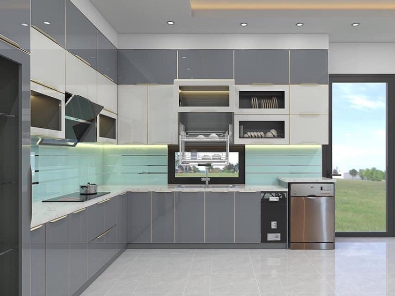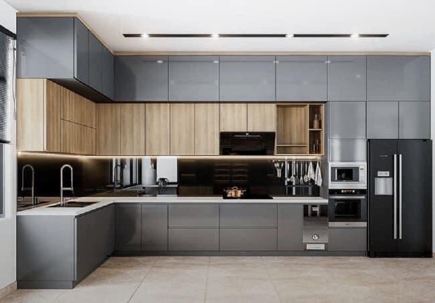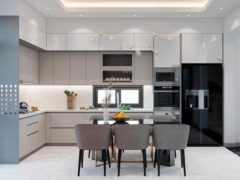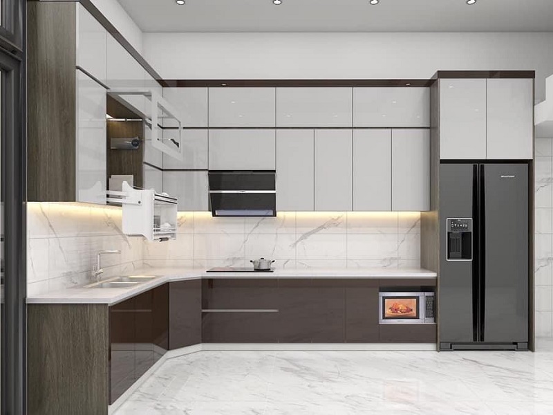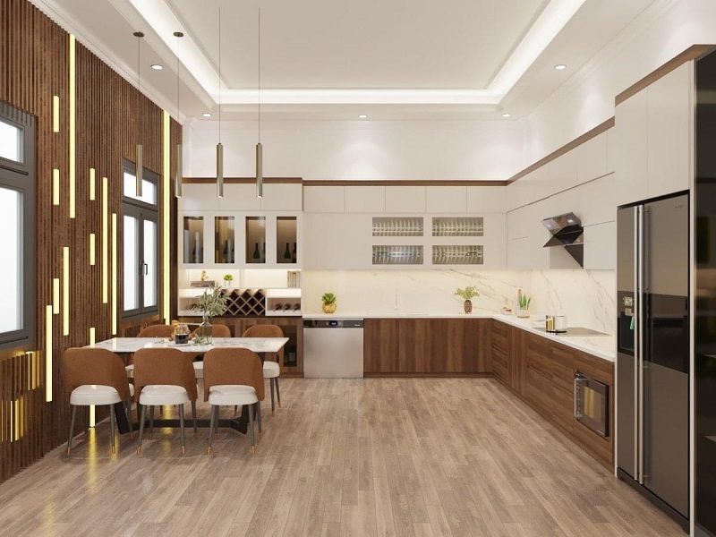 Phòng bếp gồm tủ bếp gỗ công nghiệp cánh Melamine chống ẩm.